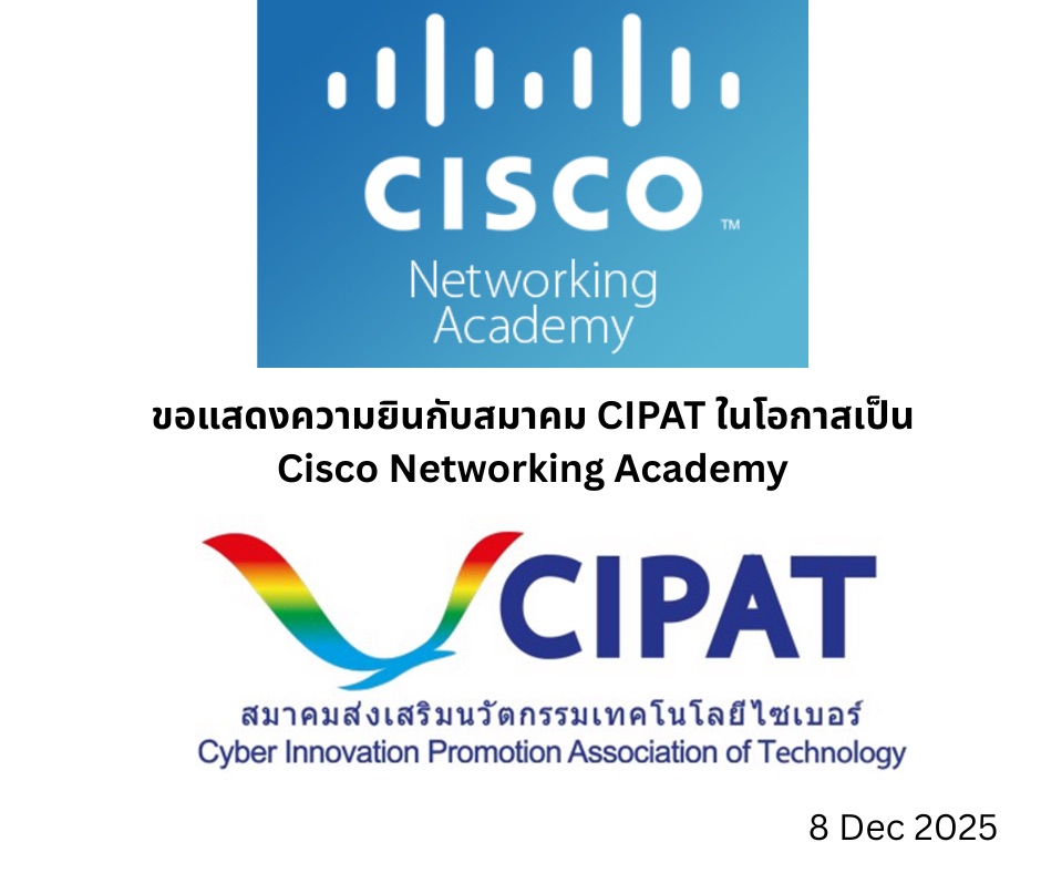 สมาคม CIPAT ขอขอบคุณ Cisco ประเทศไทย และทุกภาคส่วนที่สนับสนุนการพัฒนาทักษะด้านเทคโนโลยีของประเทศไทยให้ก้าวหน้า และพร้อมเดินหน้าสร้างบุคลากรรุ่นใหม่ที่มีศักยภาพเพื่ออนาคตของประเทศ